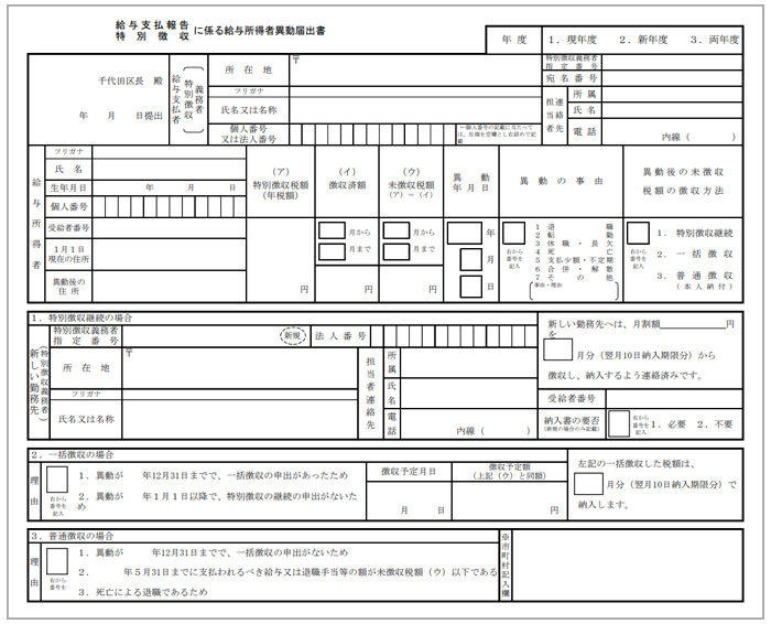 市町村長に提出した給与支払報告書に記載された者のうち特別徴収税額がない者で、4月1日現在において給与の支払を受けなくなった者がある場合に4月15日までに「給与支払報告に係る給与所得者異動届出書」を関係市町村長に提出します。提出する必要があるのは、前年 1 月 1 日現在の住所地の市区町村と、本年 1 月 1 日現在の住所地の市区町村が異なる従業員のみです。よって、転勤や引越し後に退職した従業員などが該当します。