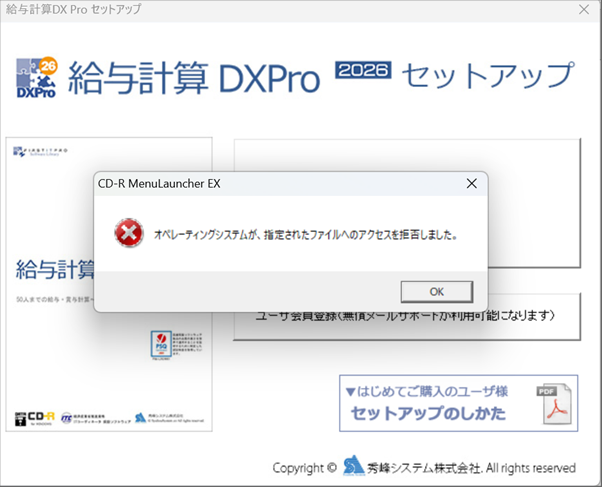 「給与計算DXPro セットアップ」タンをクリックして、起動されるファイルを直接起動することで、問題が回避できる可能性がございますので、以下のPDF資料の手順に沿って操作頂きご確認ください。