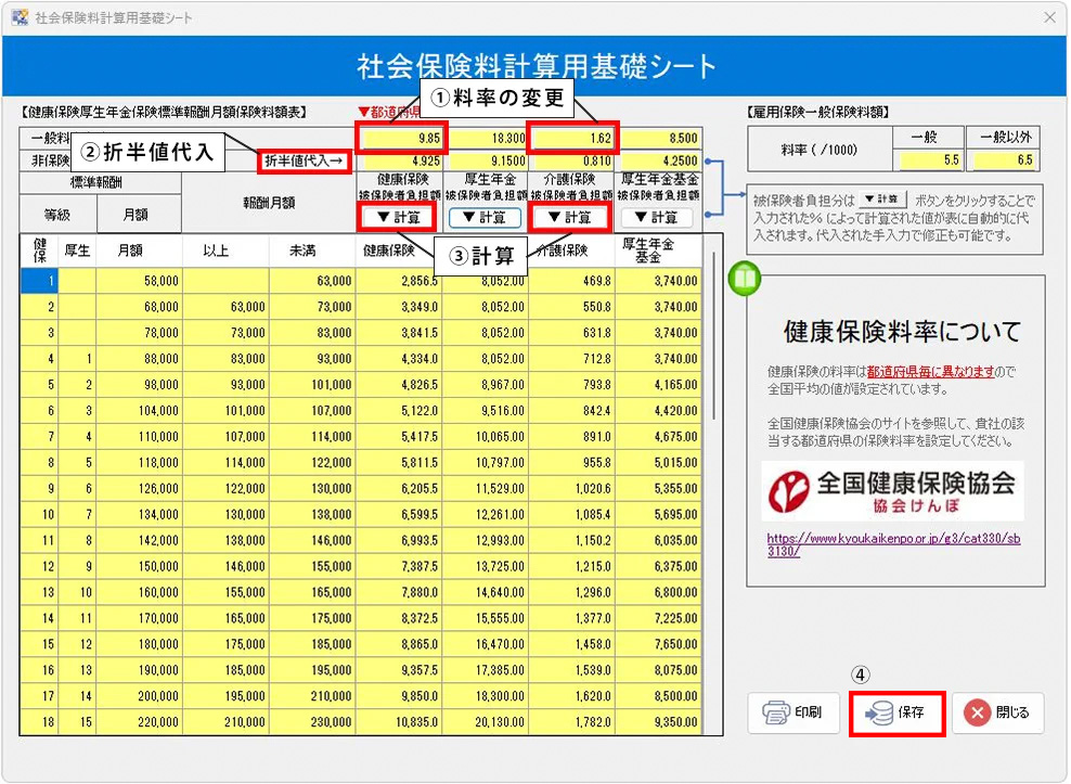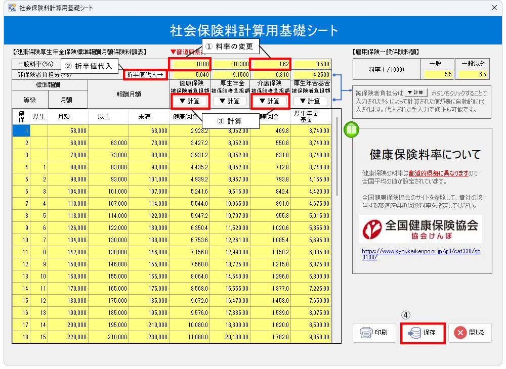 2.社会保険料計算用基礎シートの各保険料率を以下の①~④の順に操作して変更します。(画像は「東京」の場合)