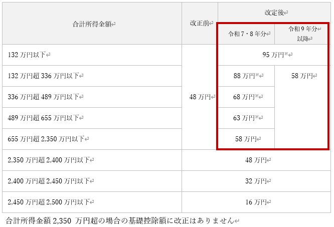 次のとおり、合計所得金額に応じて、基礎控除額が改正されました。