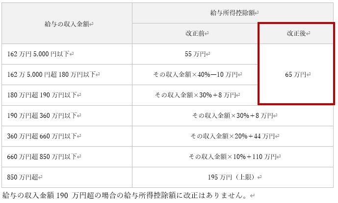 給与所得控除について、 55 万円の最低保障額が 65 万円に引き上げられました 。