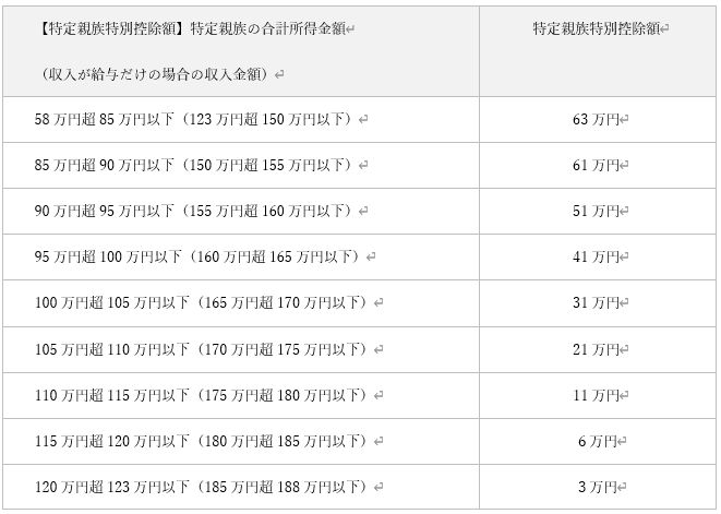き、その特定親族の合計所得金額 に応じて 次の 金額を控除する特定親族特別控除が創設されました。