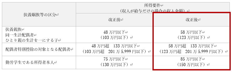 基礎控除の改正 に伴い、 次の表のとおり、扶養控除等の対象となる扶養親族等の所得要件 が 改正されました 。また、給与所得控除の改正に伴い、家内労働者等の事業所得等の所得計算の特例について、必要経費に算入する金額の最低保障額が 65 万円(改正前: 55 万円)に引き上げられました。