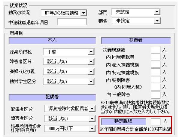 画面に「特定親族数」を追加しました。年齢 19 歳以上 23 歳未満で、年間の所得合計金額が100万円未満の親族数を入力します。
