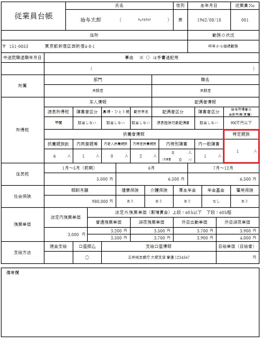 (2)[従業員台帳]のレイアウトに「特定親族数」を追加