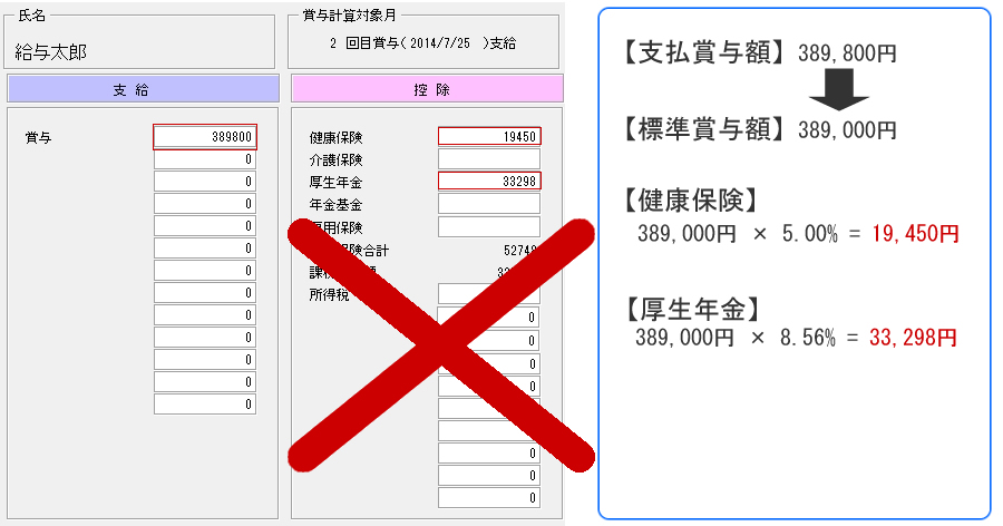 2回目の賞与で初回と同様に標準賞与額「389,000円」として保険料を算出した場合、以下の結果となります。